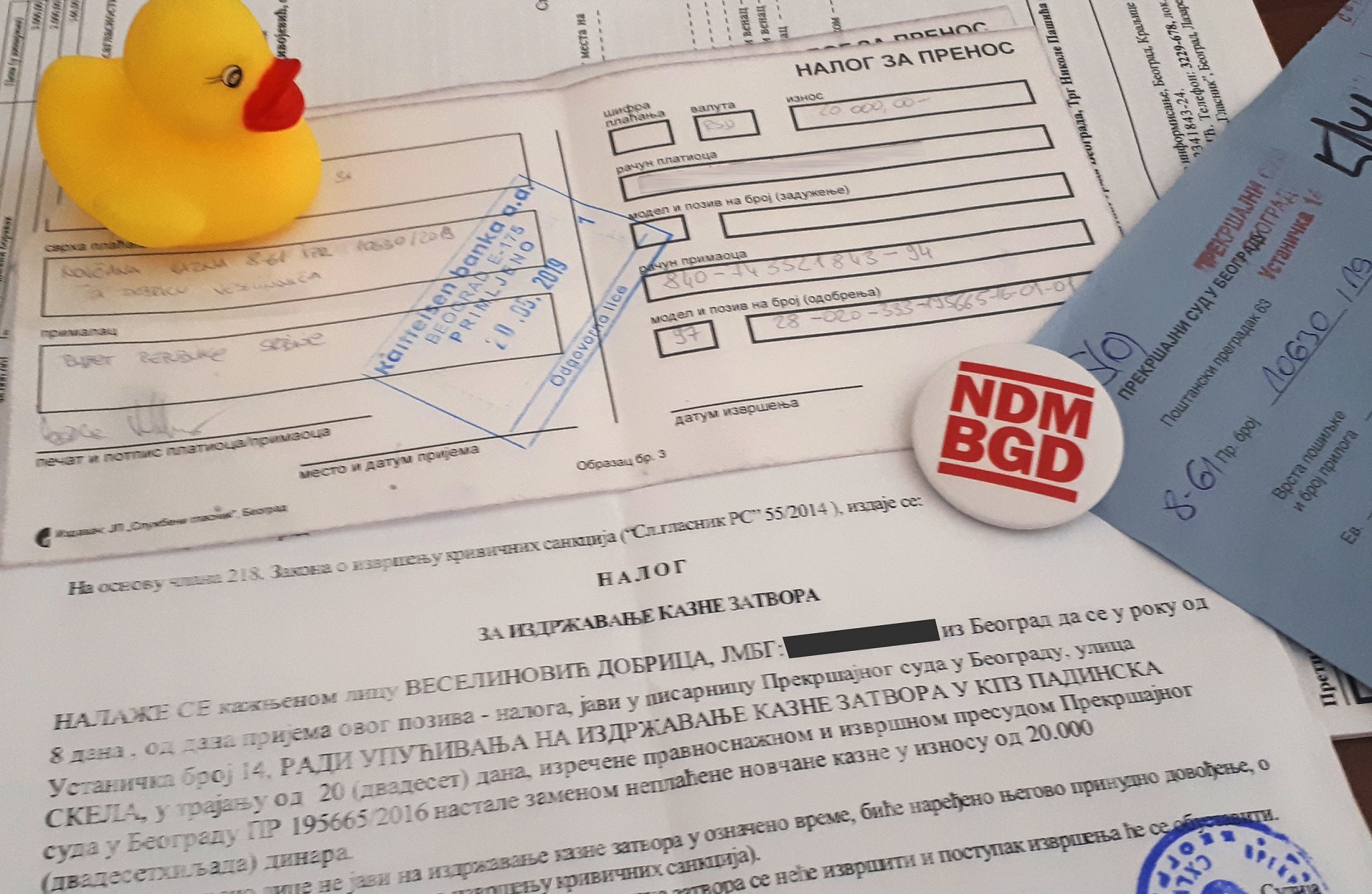 Nastavljaju se pravni pritisci na aktiviste inicijative Ne davimo Beograd. Ovoga puta, na meti se našao Dobrica Veselinović koji je proglašen odgovornim za organizaciju jednog od protesta povodom rušenja u Hercegovačkoj ulici 2016. godine. Uprkos tome što je Inicijativa platila kaznu na koju je osuđen, Dobrici je izdat nalog za odsluženje zatvorske kazne u trajanju od 20 dana.