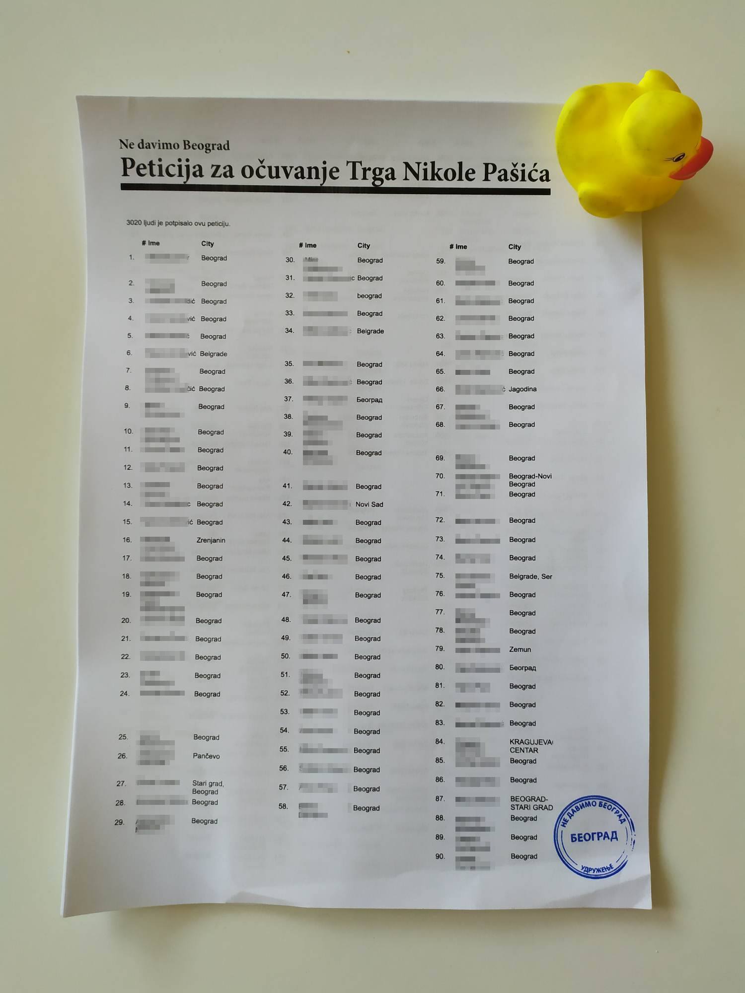 U kratkotrajnoj peticiji koju je organizovala Inicijativa Ne davimo Beograd prikupljeno je preko 3000 potpisa građana i građanki Beograda kojima se zahteva očuvanje Trga Nikole Pašića. Danas smo sve potpise predali na pisarnicu kabineta Gradonačelnika.