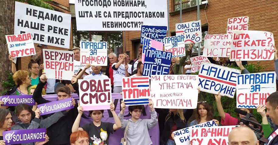 Активисткиње и активисти Не Давимо Београд, женских организација, и заинтересовани грађани и грађанке окупили су се јуче испред Основног суда у Брусу како би исказали подршку Марији Лукић, Данијели Вукајловић и другим жртвама сексуалног узнемиравања Милутина Јеличића Јутке. Неколико десетина активисткиња и активиста је уз поруке “Зауставимо насилнике”, “Наше хероине”, “Правда за Марију и Данијелу”, “Не трпим” и сличним, показало да је свако насиље према женама неприхватљиво, да жртве нису саме и захтевало да одговорни сносе законске последице за дела која су урадили.