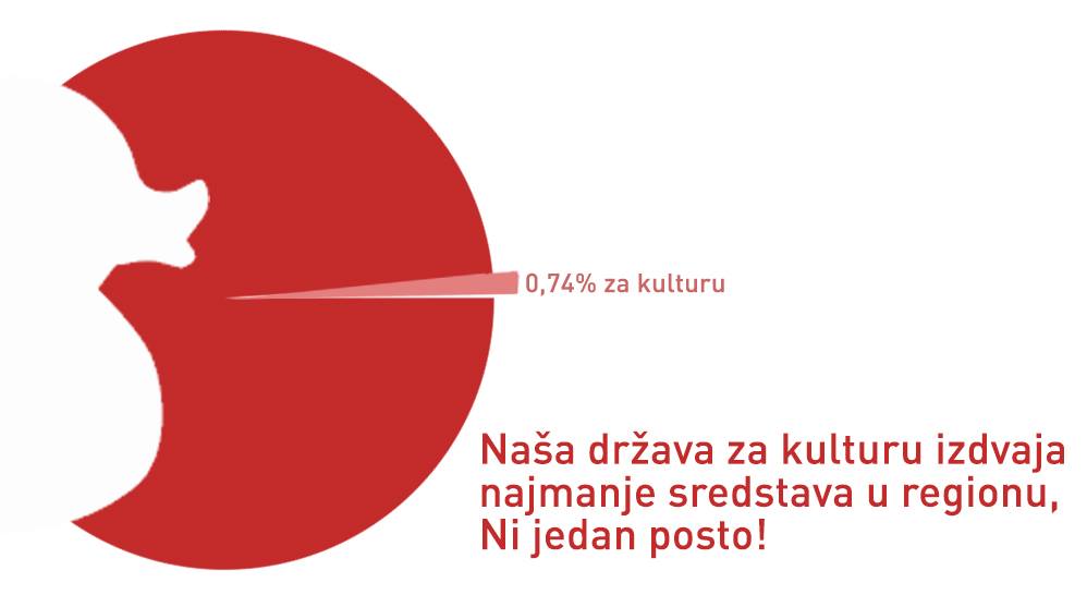 Kampanju “1% za kulturu” vidimo kao opravdani zahtev radnika u kulturi da se poboljša stanje u ovoj veoma bitnoj oblasti, ali i kao upozorenje društvu koje je dozvolilo da se nađe u ovakvoj situaciji. Celokupna godišnja izdvajanja za kulturu, dakle sve plate, svi troškovi održavanja, svi kostimi, scenografije, izložbe, štampa, računi za struju ili honorari za umetnike, iznose manje od 1% državnog budžeta ili 80 miliona evra.