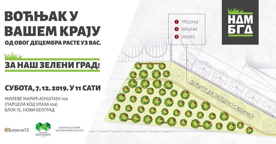 Inicijativa Ne davimo Beograd će ovog vikenda napraviti veliku akciju sadnje voćnjaka na Novom Beogradu. Pozivamo komšije i građane da nam se pridruže u subotu 7.12. od 11 časova u novobeogradskom bloku 72 (ulica Mileve Marić Ajnštajn, ispod ulaza 104), kako bismo zajedno posadili sadnice trešnje, višnje i jabuke i formirali voćnjak. Obezbedili smo alat i zalivanje voćki nakon sadnje. Događaj organizujemo zajedno sa “Blokče 72” i Udruženjem stanara “Mileva Marić Ajnštajn”.